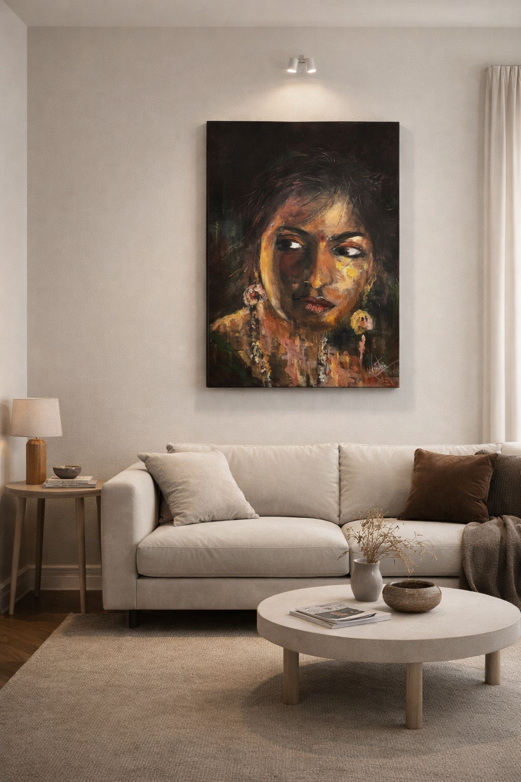Rendered in layered strokes and deep, earthy hues, this painting captures a moment suspended between silence and rebellion. There is tension in her gaze — not weakness, but awakening.