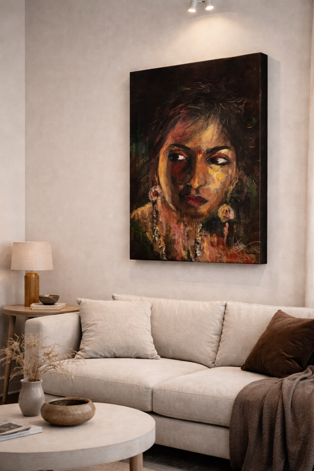 Rich, expressive brushstrokes and layered earth tones bring her emotional depth to life, making this piece both intimate and powerful.