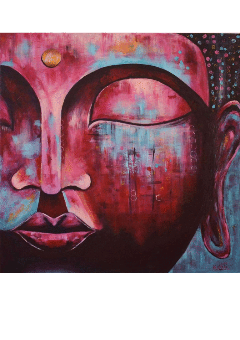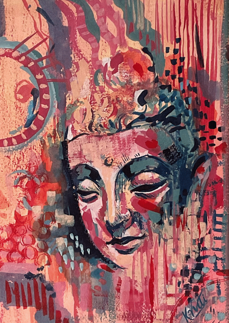 Golden Glow of Solitude is a warm, textured Buddha inspired by time spent in the mountains. Layered with gold leaf and earthy tones, this piece reflects longing, resilience, and the quiet peace found in solitude.