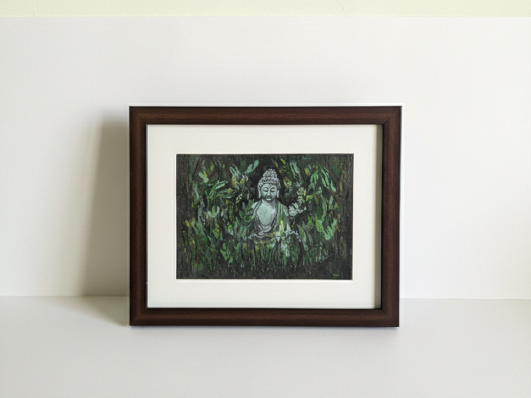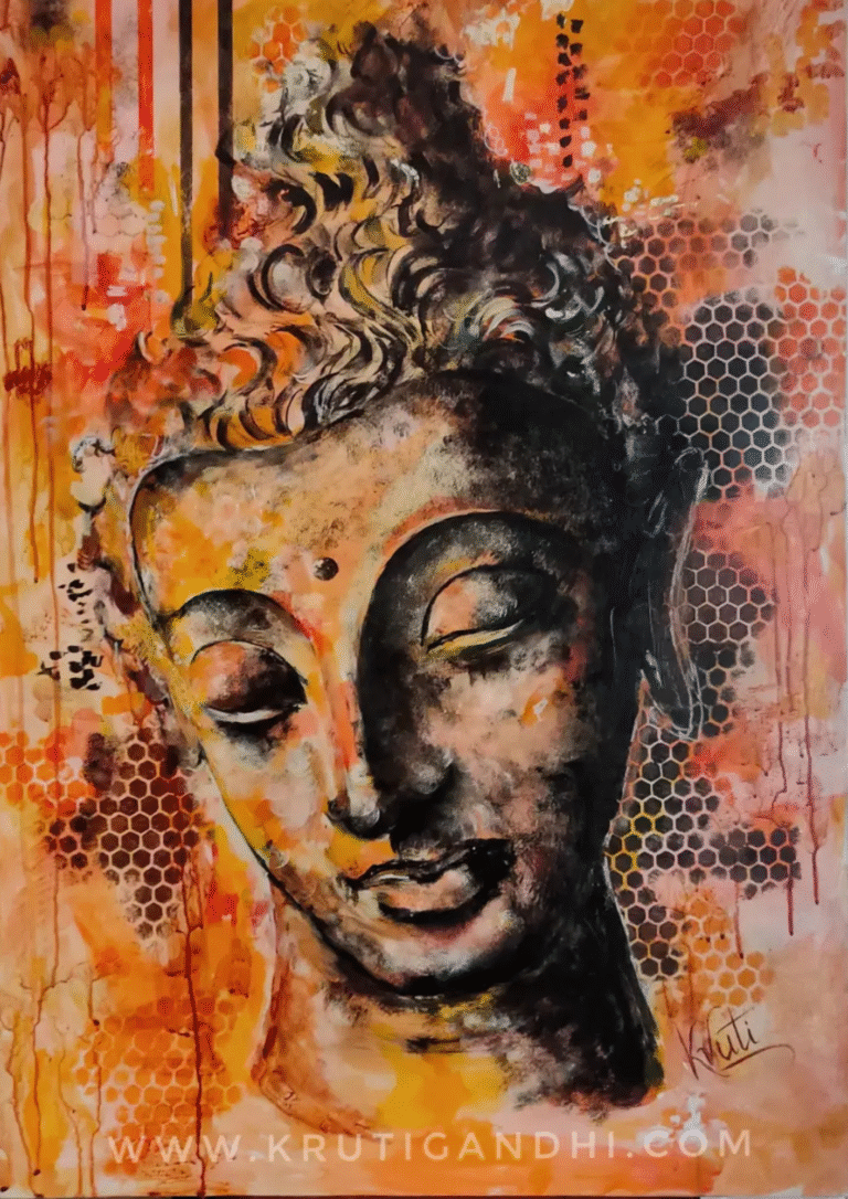 Golden Glow of Solitude is a warm, textured Buddha inspired by time spent in the mountains. Layered with gold leaf and earthy tones, this piece reflects longing, resilience, and the quiet peace found in solitude.