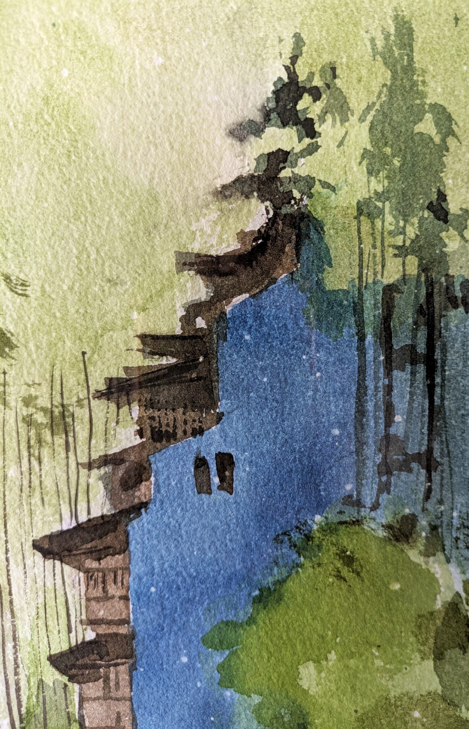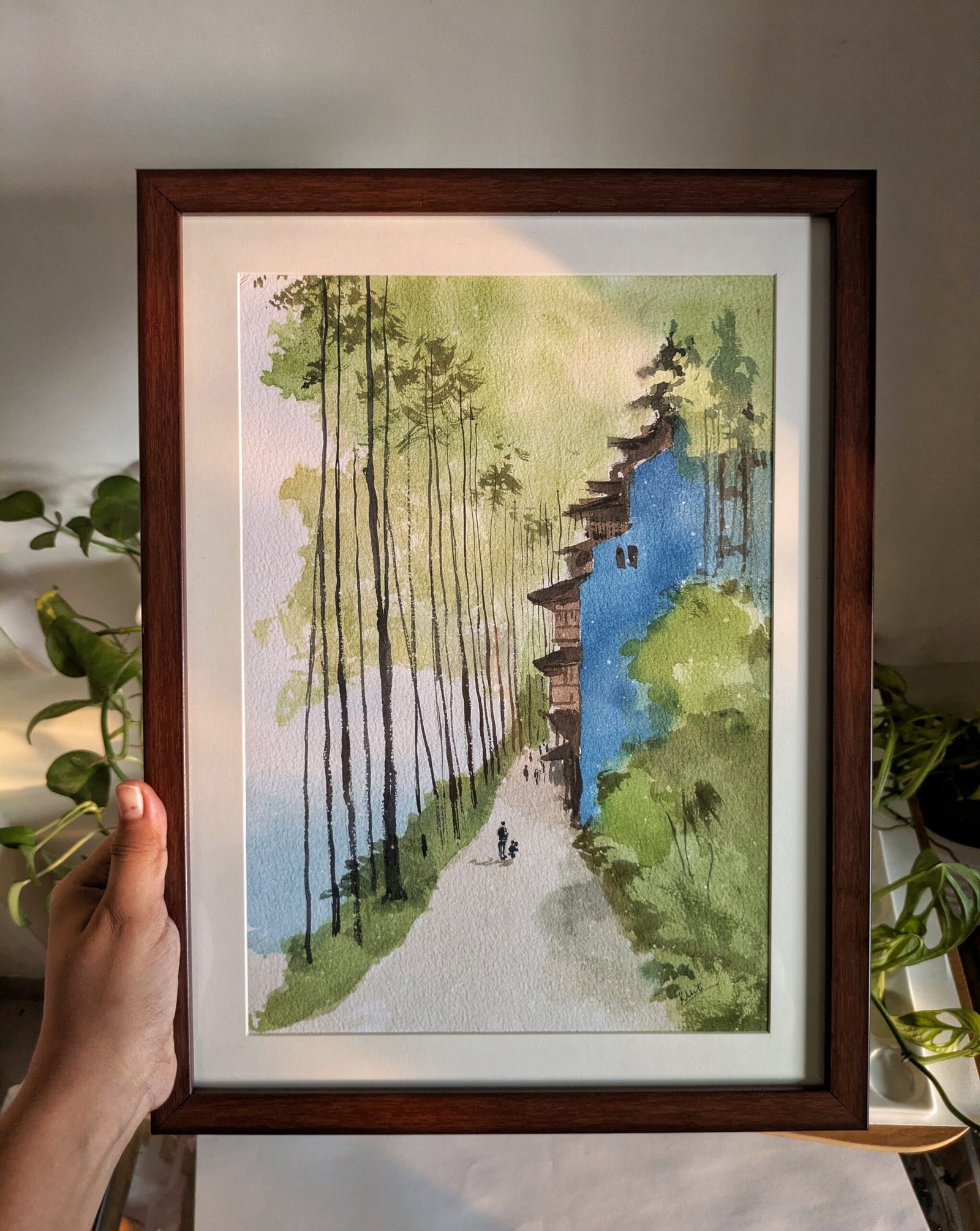 Halfway Home is an original watercolour landscape on paper, capturing a quiet pathway framed by tall trees and soft architectural forms.