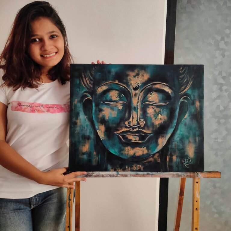 A raw and introspective interpretation of the Buddha, layered in deep teal and blush tones. This piece reflects struggle, resilience, and the quiet clarity that comes through self-awareness.